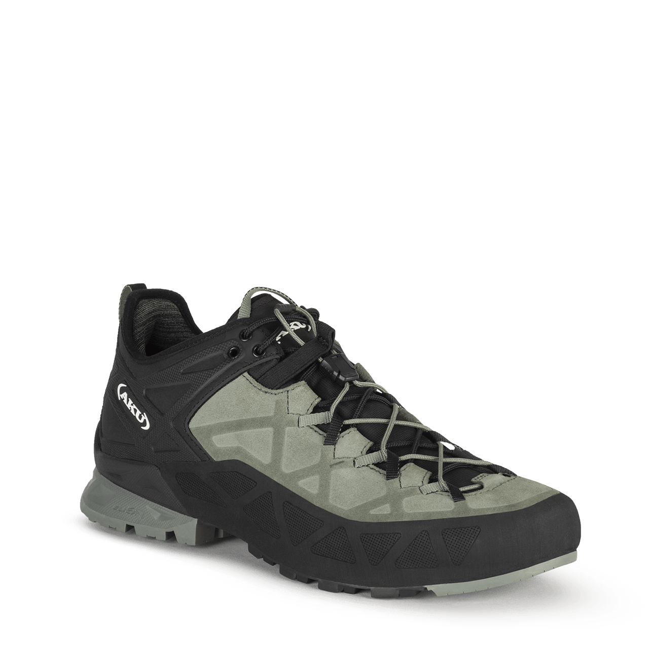 The Men's Rock DFS uses AKU's exclusive Dual Fit System (“DFS”) to give you both maximum comfort during your approach and a high-performance fit while climbing and scrambling. The Rock DFS has two separate lace zones that utilize lightweight webbing that wraps around and under your foot which enables you to customize your fit. The Rock DFS midsole incorporates a lightweight EVA foam for cushioning and a polyurethane heel for durability and support. The Vibram Approach sole with Megagrip and rubber wrapped toe rand makes the Men's Rock DFS a high-performance approach shoe with all-day comfort.