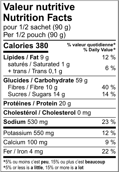 Ingredients: Chickpeas, Tempeh, Zucchini, Whole wheat couscous, Carrots, Tomatoes, Cabbage, Onion, Raisins, Canola oil, Sea salt, Spices, Dehydrated garlic.