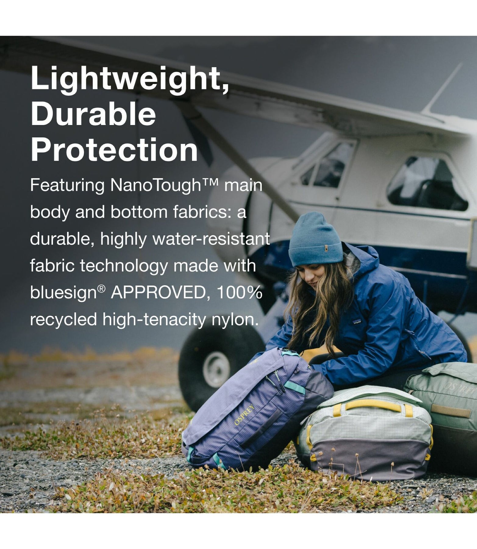 Featuring bluesign® APPROVED NanoTough™ exterior fabrics—a remarkably strong, highly water-resistant fabric technology made with 100% recycled high-tenacity nylon and carbonate coating.